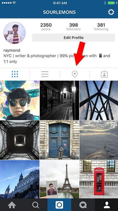 To see your own photo map, go to your profile and hit the location tag icon like this