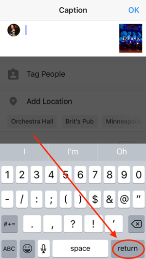 It’s a very common problem, when you write a caption in Instagram, you will notice that key doesn’t give you an option to press “Enter” 0r “Return”. This usually occur when you want to write your bio. So how do all people put line breaks in their Bio’s. It’s very easy, you have to press the “123” key in the bottom left corner of your board as you can see it in below picture