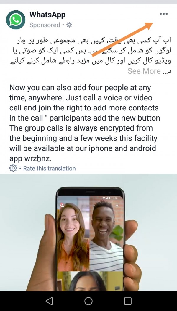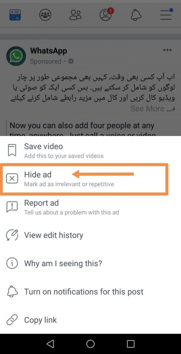 When you see some ad on facebook and don't want to keep it on the newsfeed then click on the three dots placed at the right top corner.