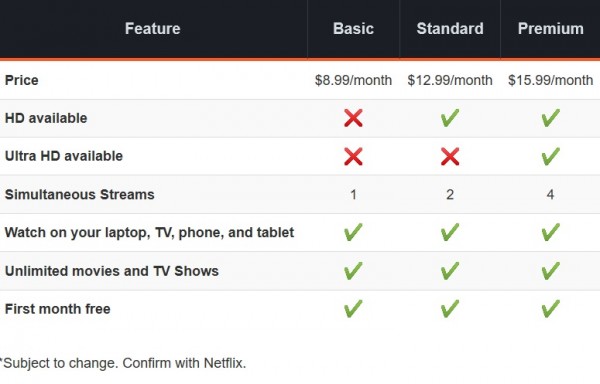 Basic: $9/month USD, Standard: $13/month USD, Premium: $16/month USD